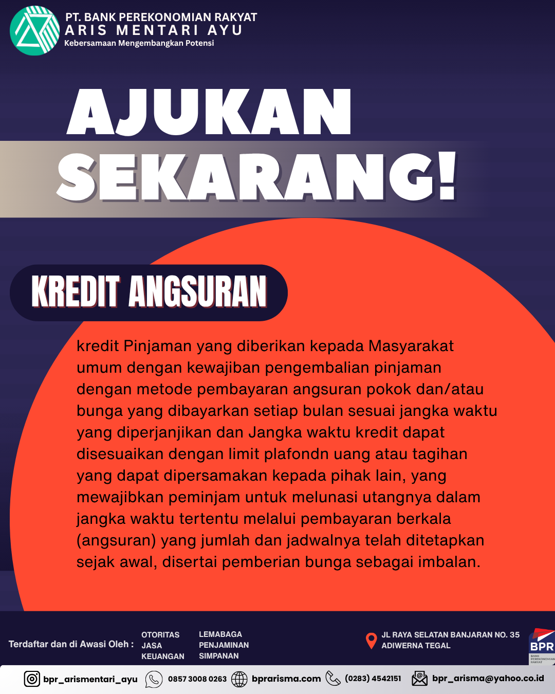 Adalah kredit atau fasilitas Pinjaman yang diberikan kepada Masyarakat umum dengan kewajiban pengembalian pinjaman dengan metode pembayaran angsuran pokok dan/atau bunga yang dibayarkan setiap bulan sesuai jangka waktu yang diperjanjikan dan Jangka waktu kredit dapat disesuaikan dengan limit plafond