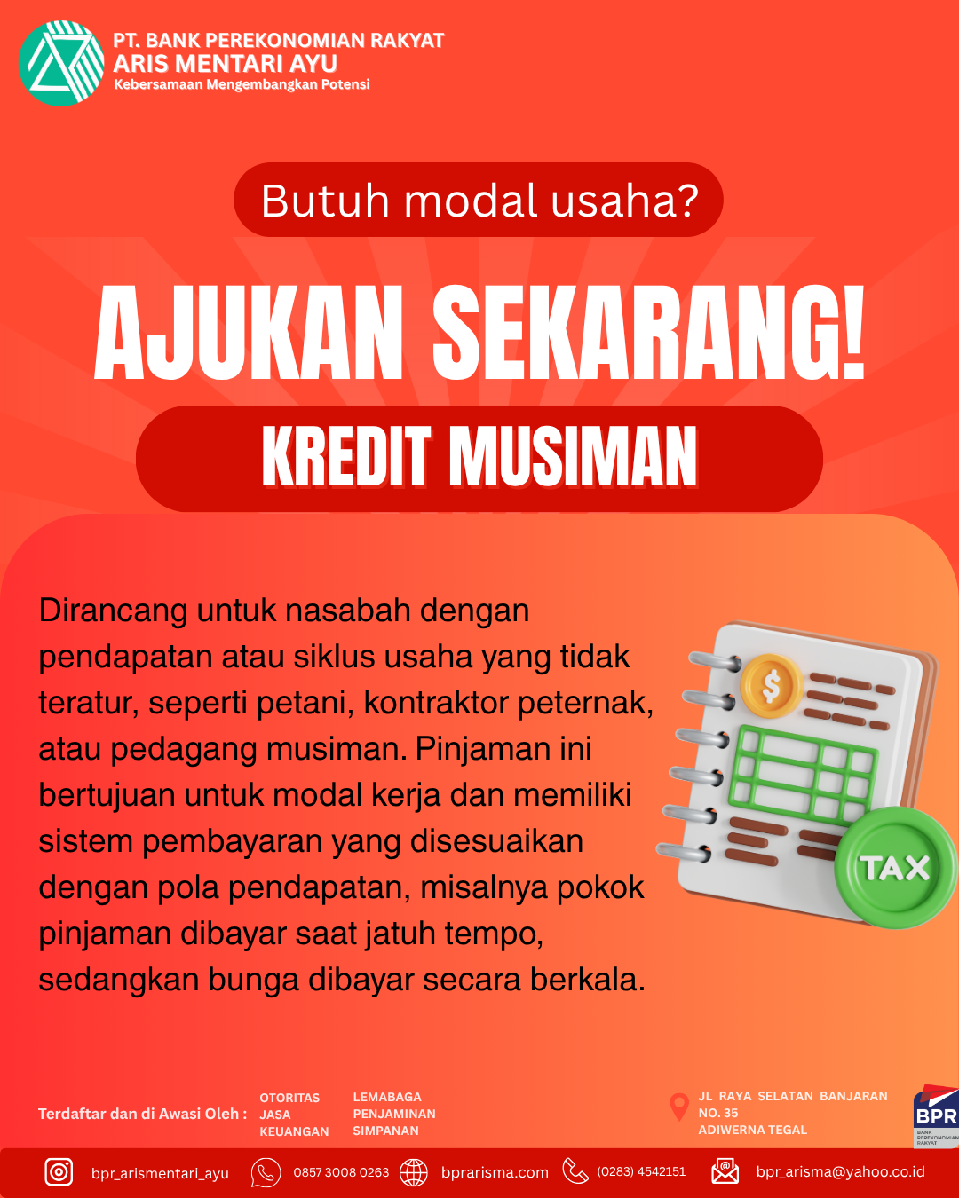 Kredit Musiman adalah salah satu bentuk fasilitas pinjaman yang diberikan BPR berdasarkan pola pendapatan atau penghasilan yang bersifat musiman atau berdasarkan schedule pembayaran yang akan diterima dari kegiatan usaha debitur dalam jangka waktu tertentu dengan tempo bisa sampai dengan 6 bulan, dan setiap bulan cukup membayar kewajiban bunganya, pokok pinjaman dibayarkan pada saat jatuh tempo.